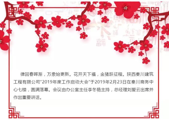熱烈祝賀陜西秦川建筑工程有限公司“2019年度工作啟動(dòng)大會(huì)”圓滿落幕。秦川建筑全體同仁斗志昂揚(yáng)、迎接新挑戰(zhàn),我們將矢志不渝、齊心協(xié)力、奮力拼搏,同心共筑秦川夢(mèng)·我的夢(mèng),譜寫秦川2019新華章。