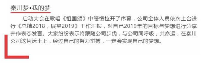熱烈祝賀陜西秦川建筑工程有限公司“2019年度工作啟動(dòng)大會(huì)”圓滿落幕。秦川建筑全體同仁斗志昂揚(yáng)、迎接新挑戰(zhàn),我們將矢志不渝、齊心協(xié)力、奮力拼搏,同心共筑秦川夢(mèng)·我的夢(mèng),譜寫秦川2019新華章。